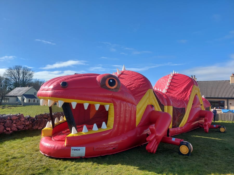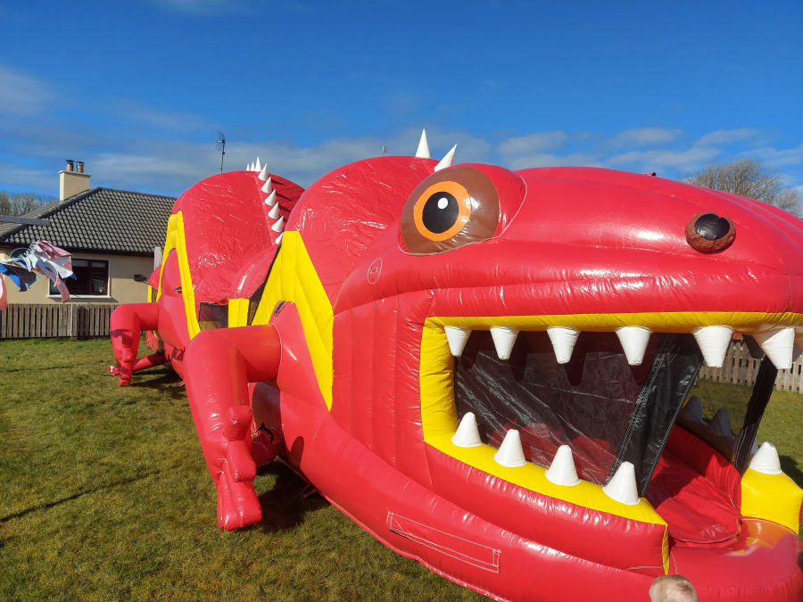 Larry the lizzard has a very tall slide 10 foot high in it's belly and he is covered, so it can be used in most weather.
