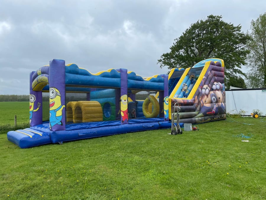 Inside there is a squeeze wall and large bounce area with a couple of bish bash columns and tunels and jump-through walls, if your feeling a bit adventurous you can climb the steps and try the huge slide down, wow!!! What a way to have fun with Stuart and Kevin hey! Let's not forget Bob the 20ft slide, guaranteed a great time with this castle, This stunning unit is designed for all the Family fun with all of the safety in mind.